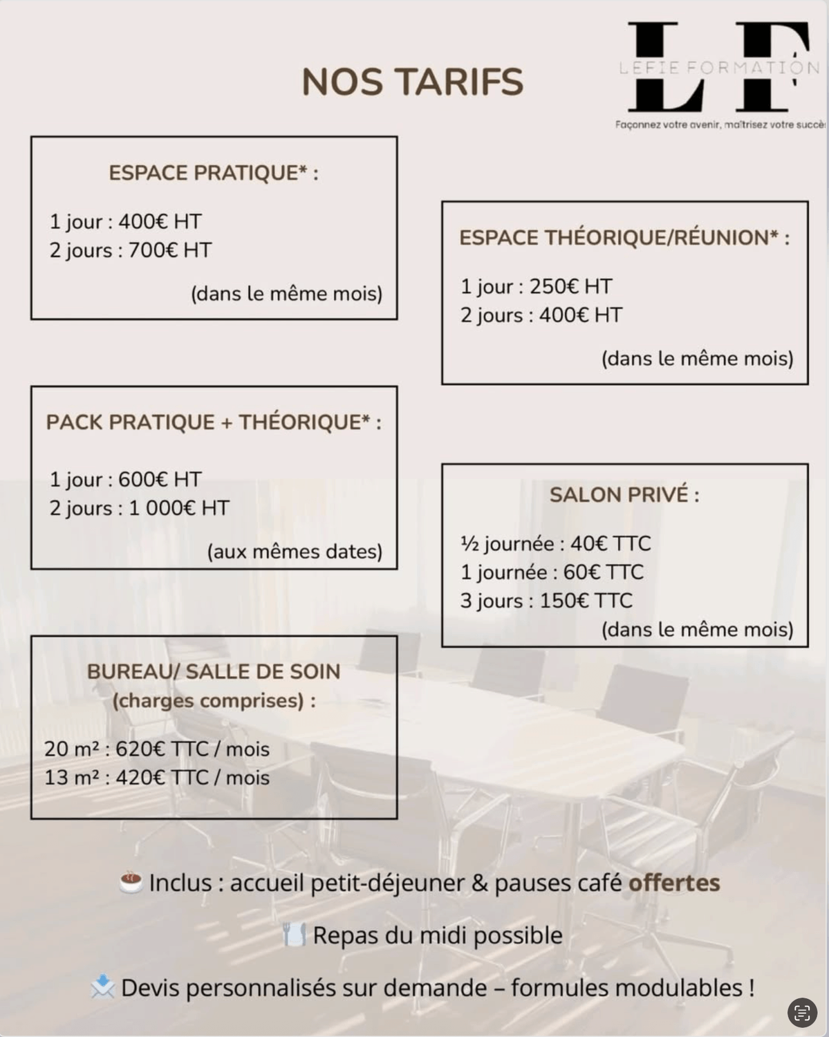 DÉCOUVREZ NOS PRESTATIONS, NOS ESPACES disponibles ainsi que nos tarifs.